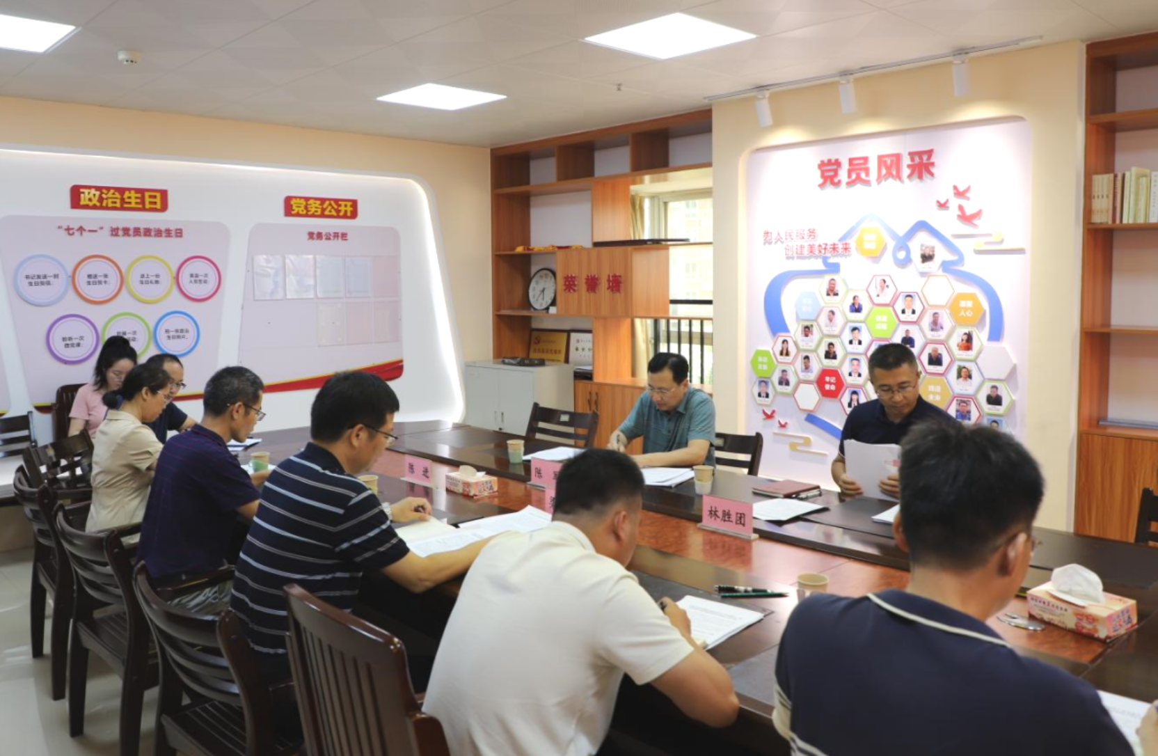 在党建文化宣传阵地,陈军逐一参观了党建文化展示长廊、模范机关与清廉机关建设宣传专栏、党员活动中心等党建阵地,通过直观感受、现场体验与交流,多角度了解市住房城乡建设局机关党建文化、党建品牌和模范机关、清廉机关建设等方面取得的成效情况。