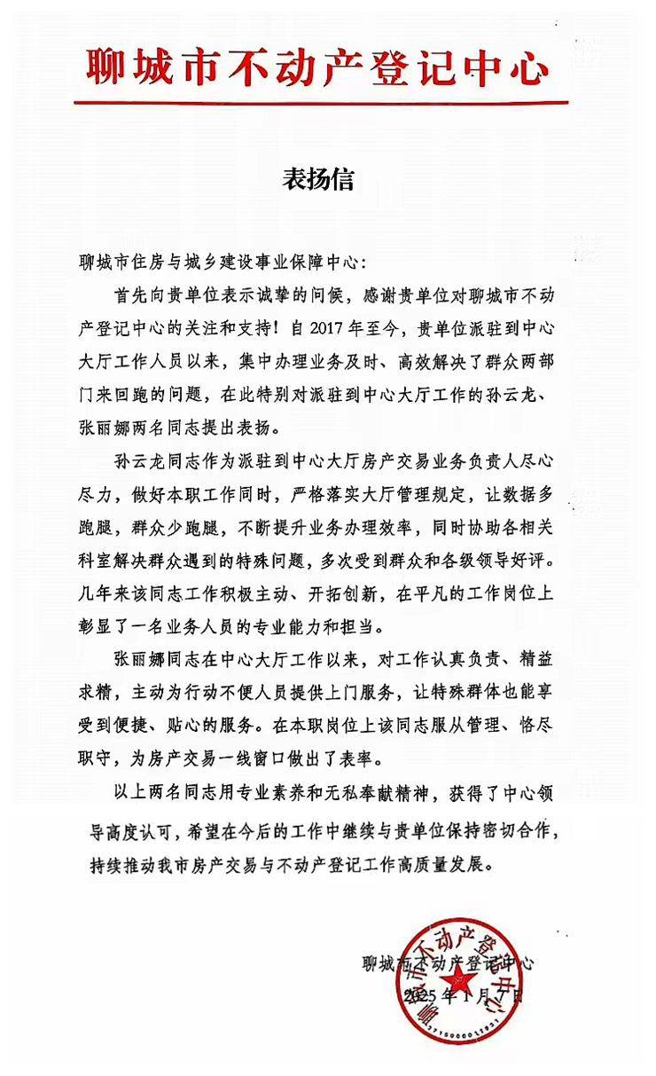1月7日,一封表扬信送到市住建局派驻市不动产登记中心业务窗口工作人员孙云龙、张丽娜手中,感谢他们主动担当、靠前服务,用心用情、用高质高效的工作服务,让办事群众少跑腿,为群众提供了方便快捷的一站式服务。