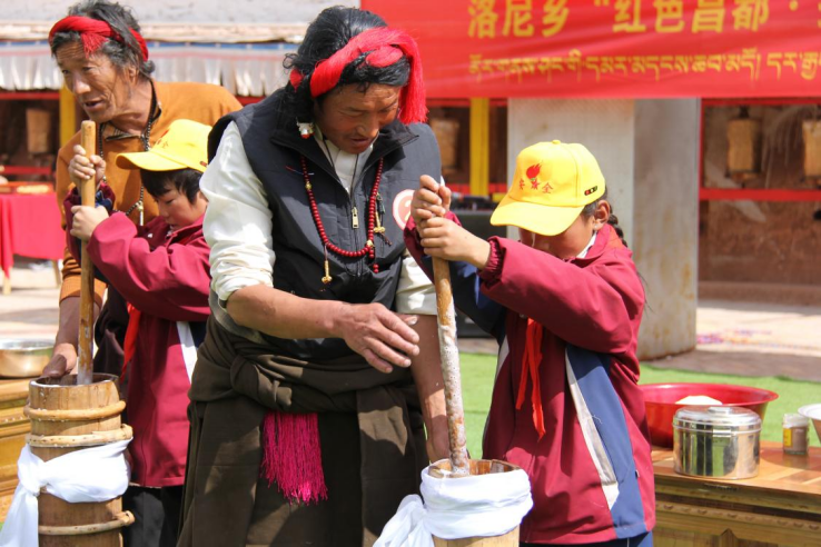 图为芒康县洛尼乡手磨糌粑比赛现场。