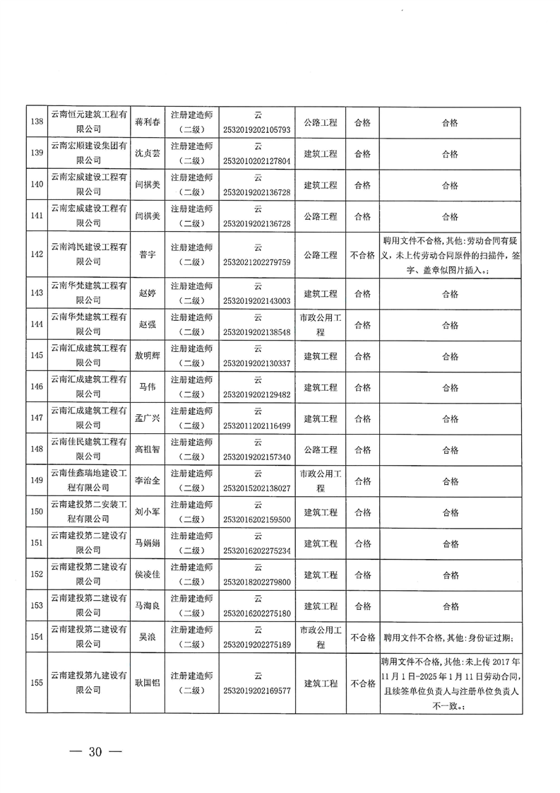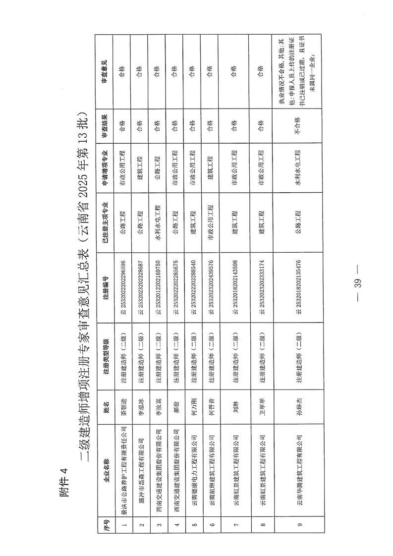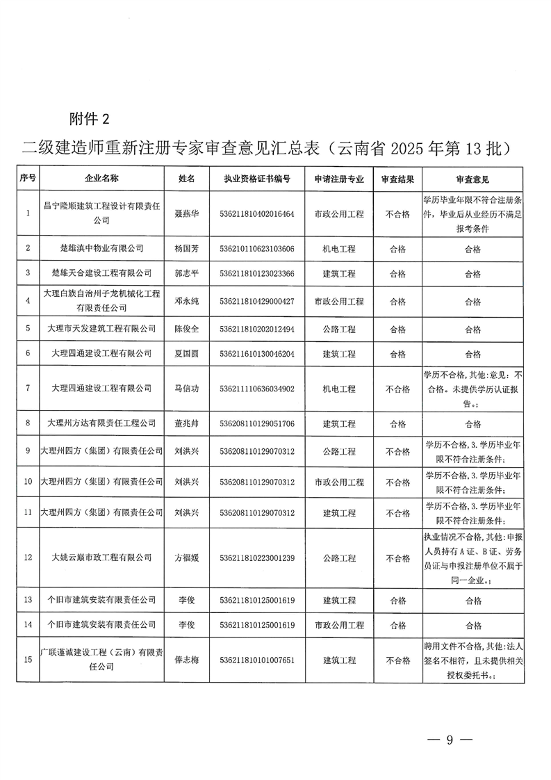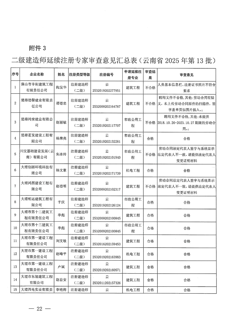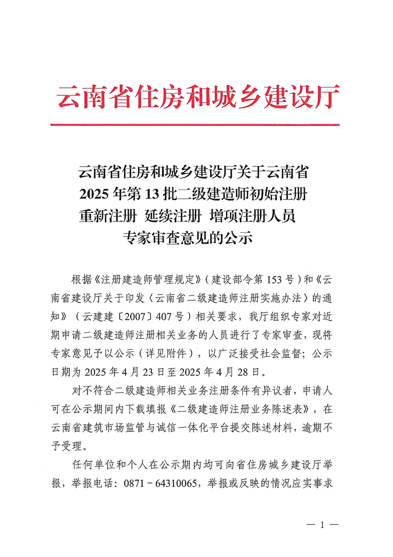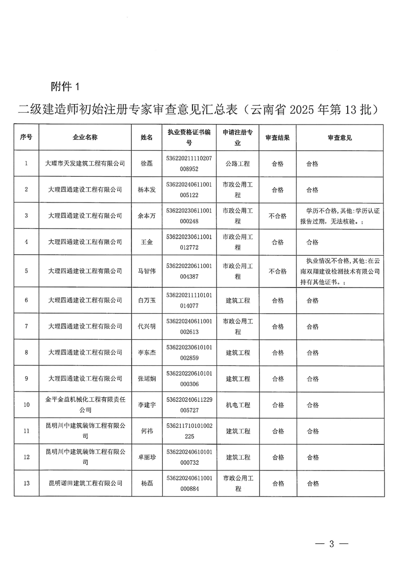 云南省住建厅关于云南省2025年第13批二级建造师初始注册重新注册延续注册增项注册人员专家审查意见的公示