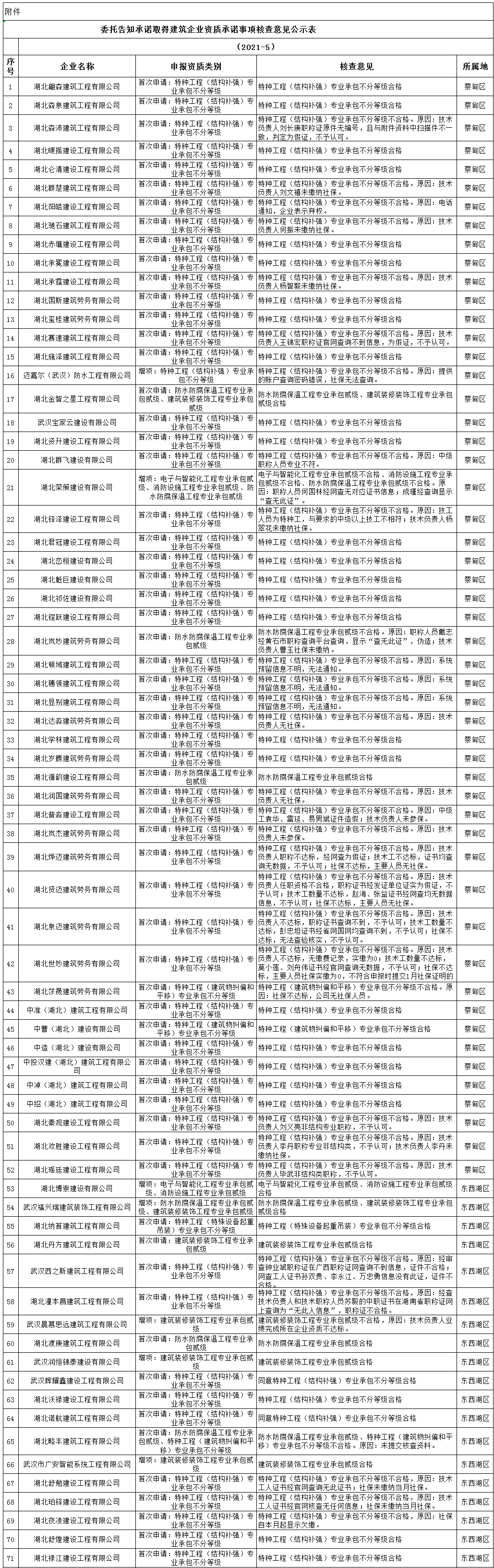 根据《建筑业企业资质管理规定》(住房和城乡建设部第22号令)、《建筑业企业资质标准》(建市〔2014〕159号)、《关于开展建筑业企业资质“告知承诺”审批试点工作的通知》要求,我局组织各区建管部门及专家对湖北翩森建筑工程有限公司等767家通过告知承诺审批方式取得建筑业企业资质的承诺事项进行了核查。现将核查情况予以公示,并就有关事项通知如下: