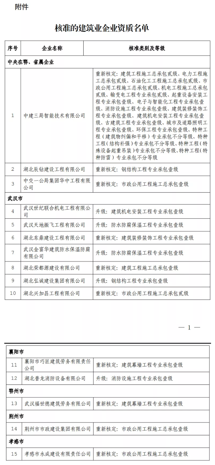 湖北省住房和城乡建设厅关于公布核准的建筑业企业资质名单的公告
