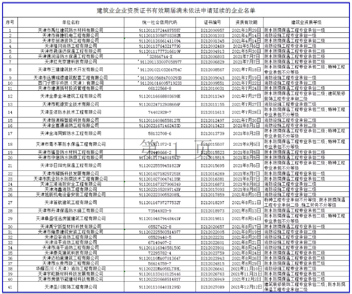 经查,天津市禹红建筑防水材料有限公司等41家建筑业企业所持有的资质证书已于2021年12月31日前有效期届满,未依法申请延续。依据《建筑业企业资质管理规定》(住房城乡建设部第22号令)第三十条的有关规定,现我委依法注销以上企业所持有的建筑业企业资质,并向社会公布其建筑业企业资质证书作废。请各企业自公告发布之日起10个工作日内,将所持建筑业企业资质证书(含正、副本)交回资质许可机关。