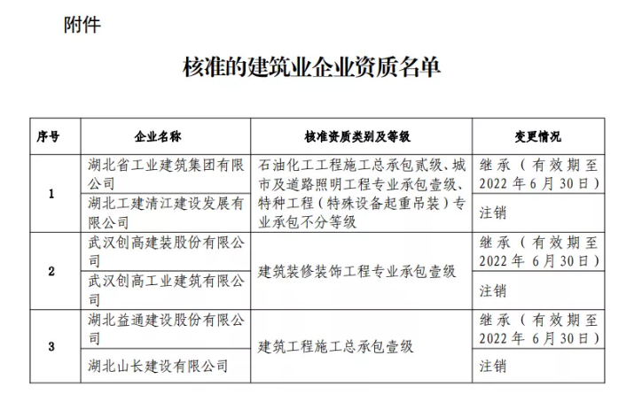 湖北省住建厅关于公布核准的建筑业企业资质的公告