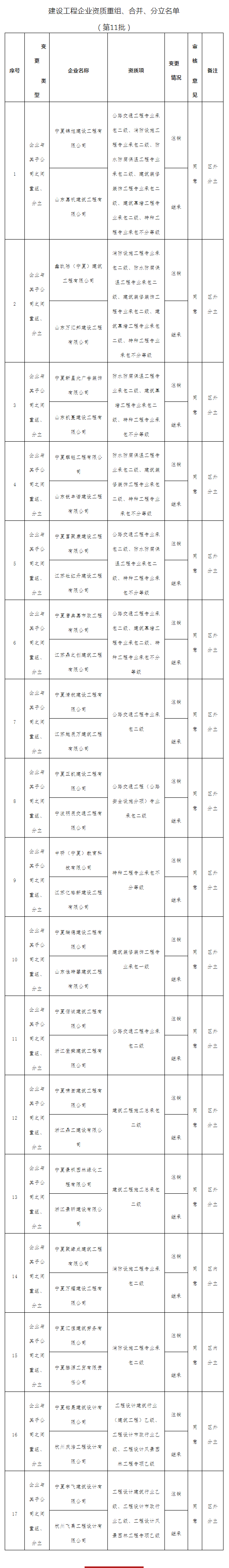 宁夏住建局关于核准2022年度第11批建设工程企业资质重组、合并、分立的公告