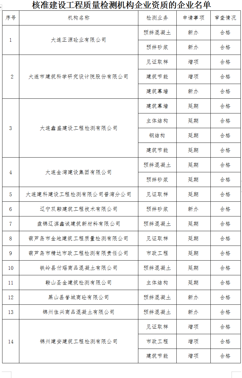 辽宁省住建厅关于核准工程质量检测机构企业资质的公告
