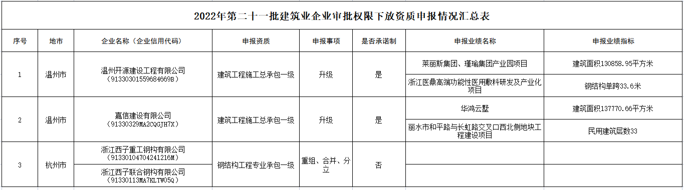 现将2022年度第二十一批建设工程企业资质(住房和城乡建设部审批权限下放试点资质)申报情况在浙江省住房和城乡建设厅门户网站(http://jst.zj.gov.cn/)予以公示,以广泛接受社会监督。公示内容详见附件。