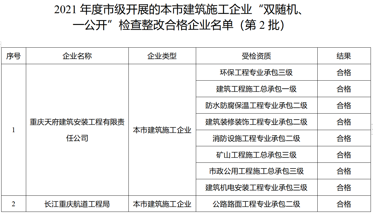 根据重庆市住房和城乡建设委员会《关于2021年度市级开展的本市建筑施工企业“双随机、一公开”检查结果的通报》(渝建管〔2022〕51号)的有关要求,市住房城乡建委对近期提交整改资料的本市建筑施工企业进行了审查,现将整改合格的6家企业名单予以公布。