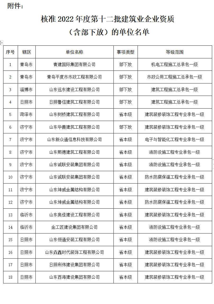 根据《建筑业企业资质管理规定》(住房城乡建设部第22号令)、《建筑业企业资质标准》(建市〔2014〕159号)、《住房和城乡建设部办公厅关于扩大建设工程企业资质审批权限下放试点范围的通知》、《住房城乡建设部关于简化建筑业企业资质标准部分指标的通知》(建市〔2016〕226号)和《山东省行政程序规定》,我厅对近期申请建筑业企业资质(含部下放)的审查情况进行了公示,并经公示无异议。现将核准青建集团有限公司等18家企业申请的20项资质予以公告。