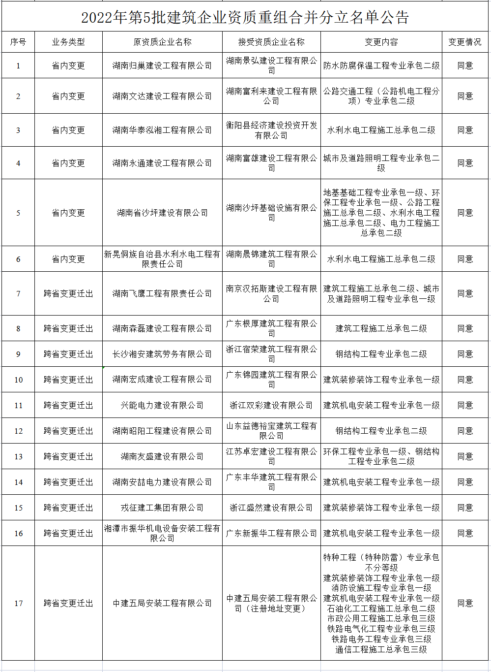 湖南省住建厅关于2022年第5批建筑业企业发生重组合并分立等情况资质核准名单的公告