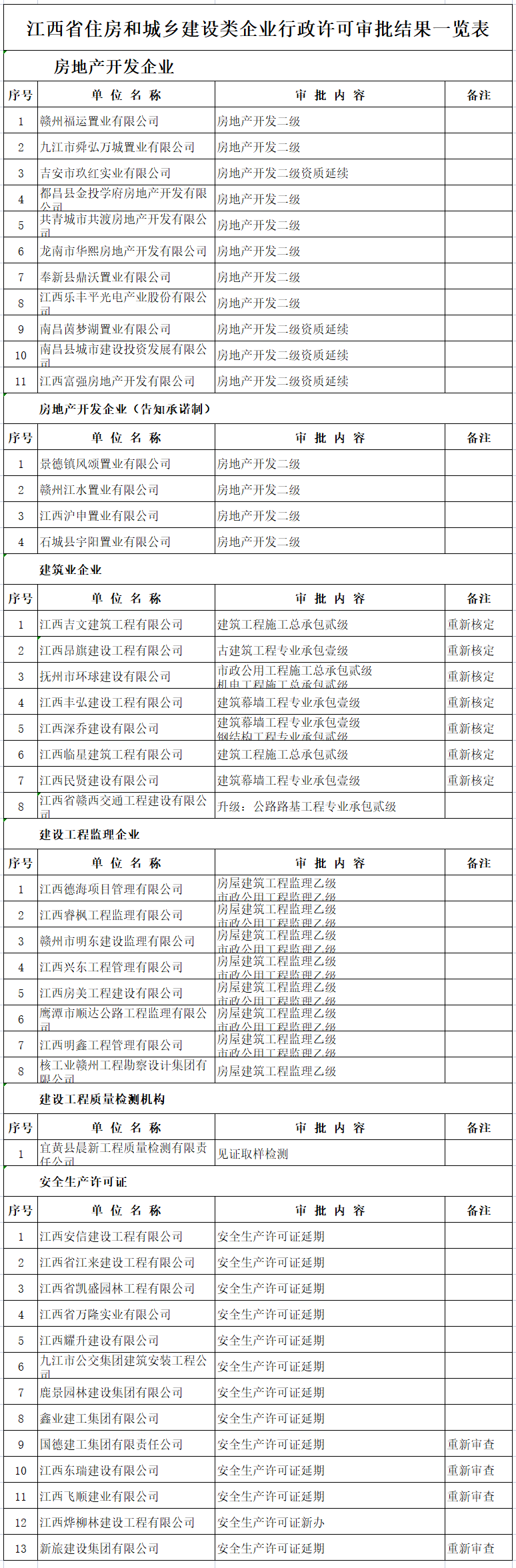 江西省住建厅关于公布住房城乡建设类企业行政许可结果的通告