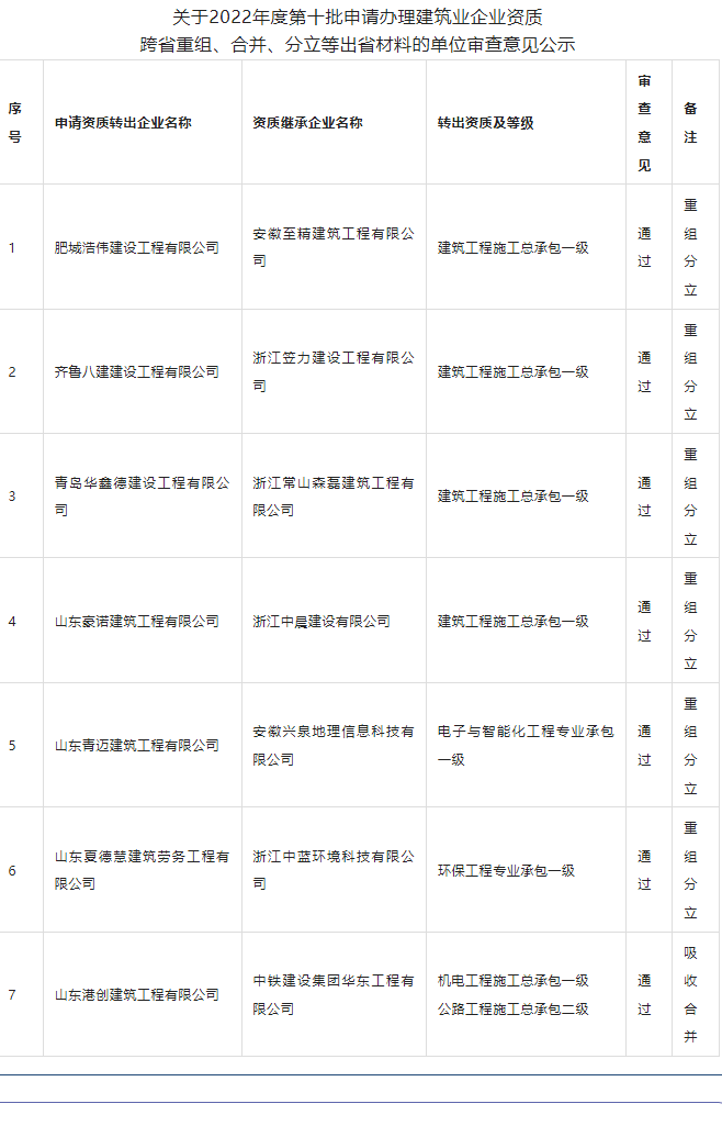 山东省住房和城乡建设厅关于2022年度第十批申请办理建筑业企业资质跨省重组、合并、分立等出省材料的单位审查意见的公示