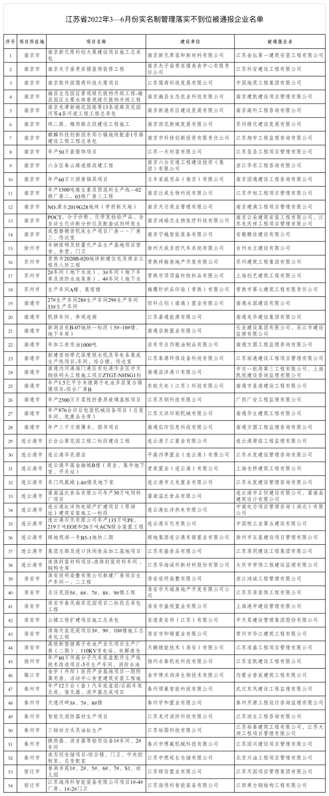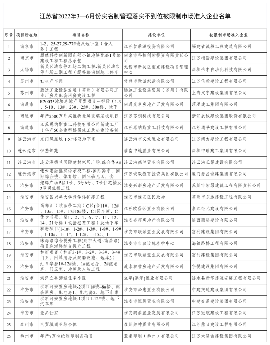 江苏省住房城乡建设厅关于发布2022年3—6月份实名制管理落实整改不到位企业名单的通知