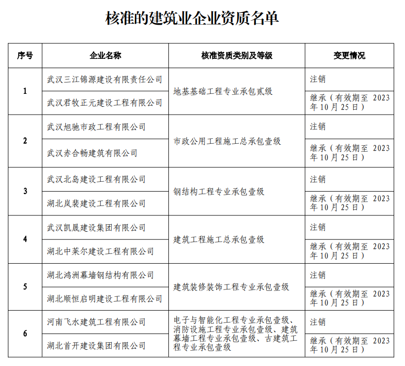 湖北省住建厅关于公布核准的建筑业企业资质名单的公告