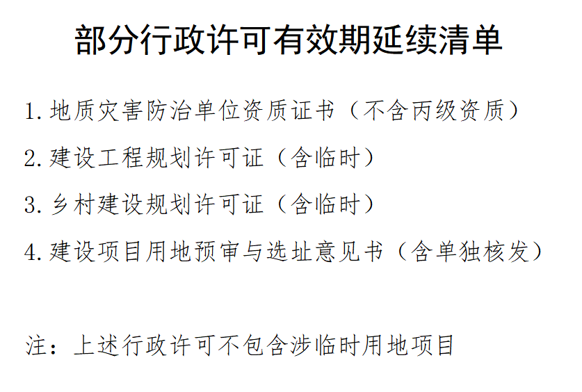 一、我委及各分局针对地质灾害防治单位资质(不含丙级资质)、建设工程规划许可、乡村建设规划许可、建设项目用地预审与选址意见书等事项核发的行政许可(详见附件),有效期在2023年1月1日至2023年6月30日期间届满的(含已延期的行政许可)有效期自动顺延6个月,且无需换发新行政许可证书。