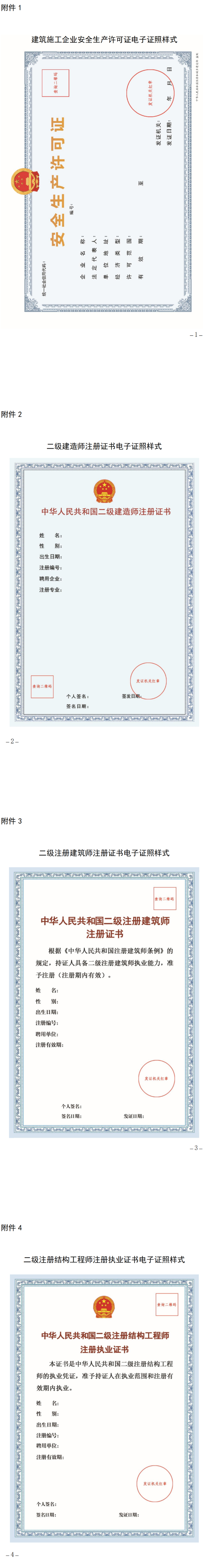 根据国务院办公厅电子政务办公室、住房和城乡建设部发布的《全国一体化政务服务平台标准》要求,为进一步统一相关电子证照标准,经研究决定,我省核发的建筑施工企业安全生产许可证、二级建造师注册证书、二级注册建筑师注册证书、二级注册结构工程师注册执业证书、建筑施工企业安全生产管理人员考核合格证书、建筑施工特种作业操作资格证书等电子证照样式按标准进行调整,于2023年1月1日起启用新样式电子证照。上述电子证照更新后自动在“浙江政务服务网”推送,各相关企业或个人需注册并登录“浙江政务服务网”账号进行下载。