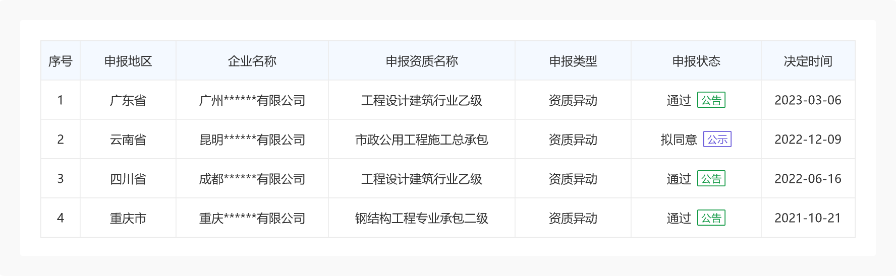 序号 | 申报地区 | 企业名称 | 申报资质名称 | 申报类型 | 审批阶段及状态 | 决定时间 |